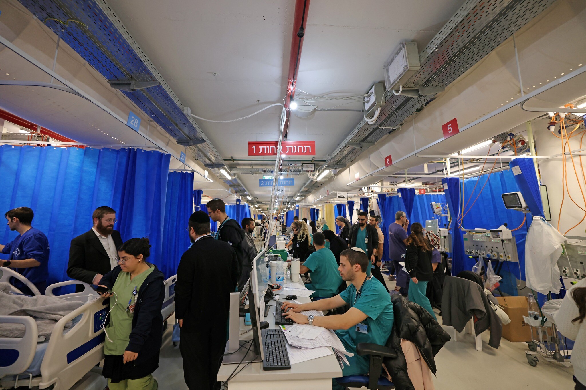 Hospital staff and patients work in a ward that has been relocated to the parking lot at Hadassah Mount Scopus Hospital for safety on March 1, 2026. (AHMAD GHARABLI / AFP)